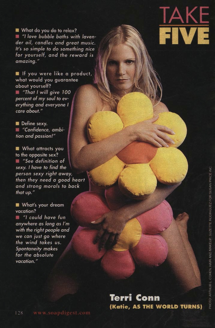 Been There, Done That ... with Terri Conn (Soap Opera Digest - September 26, 2000) What has your character been through that you have, too? Terri: "I've definitely been insecure before, but I never acted out the way she does," chuckles Conn. "And when she first came on the show, she was such a people pleaser putting on that smile and doing and saying the things that people want to hear. I've done that in my life, and I'm trying to get out of it because you're who you are, and if people like it, that's great, and if they don't, then they don't need to be a part of your life."