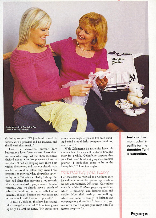 Star Style - Just Askin' Terri Colombino (Soap Opera Digest - March 23, 2004) How have you adapted your style for your pregnancy? Terri: "I just started getting clothes. My mom was recently in town, so of course we went shopping, and it's so funny because they have these little pillows - like they have here [at the studio] for when a character is pregnant - that you can strap on and it adds three months, so you can see how things are going to fit. We got some spring things for when I will be bigger and they're really cute - I was surprised! We only got a couple of shirts; pants will be the tough part, I'm sure. But I hear they make Seven jeans and Earl jeans in maternity now, so I'll definitely be getting some of those. Most people say, 'Don't spend a lot of money on maternity clothes because you don't wear them too long.' So now, in the transition period when my regular pants are tight but I can't wear maternity clothes yet, I just go to H&M or Old Navy and get a pair that's one size bigger than I normally wear. One of my girlfriends gave me this tip: take a hair rubber band, put it around the button, then through the buttonhole and then put the other end over the button, and it gives you an extra inch. Of course, that's when it still fits everywhere else, but not the belly!"